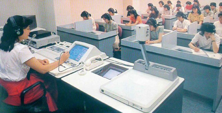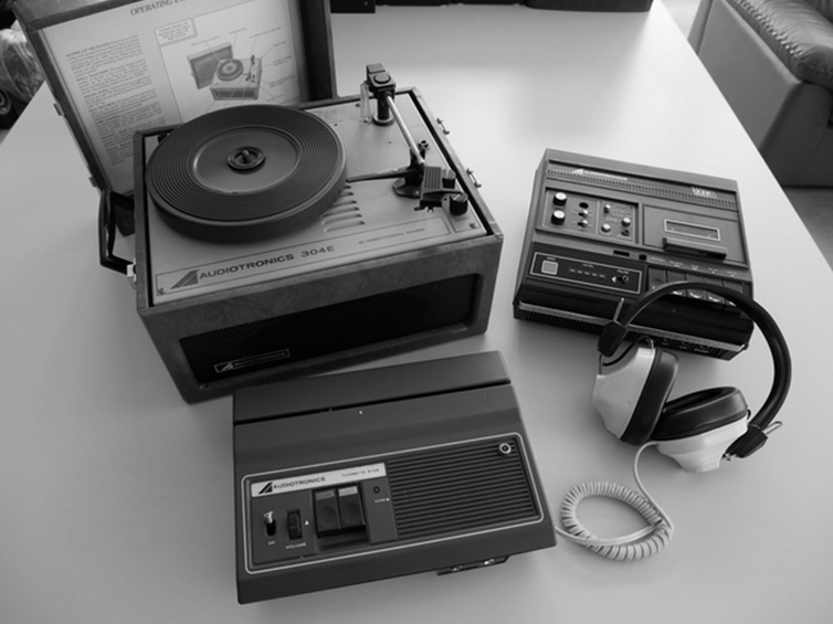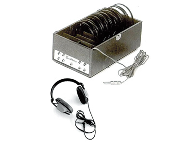 一度に6人が同じ教材を聞くことができる、といった教育機器でした。これはヘッドホン6台が専用木箱に入っており、蓋をあけると、その箱の中央にある分配器にもとの入力ソースを送ると、6台のヘッドホンで聞くことができました。